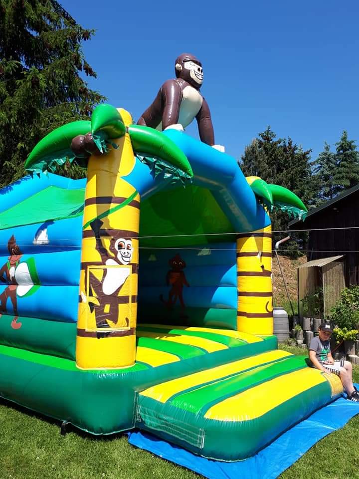 Bunt, auffällig und fröhlich! Unsere Hüpfburg Gorilla überzeugt durch ihr ganz besonderes Design. Nicht nur die Palmen sind in einer 3D Optik dargestellt, auch der Gorilla am Dach. Die Hüpfburg wurde in den Farben Gelb, Blau und Grün gestaltet und alle Seitenwände – sowohl innen als auch außen – sind mit fröhlichen Dschungelbildern bedruckt. Die Hüpfburg Gorilla darf auf keinem Kindergeburtstag und bei keinem Stadtfest fehlen.